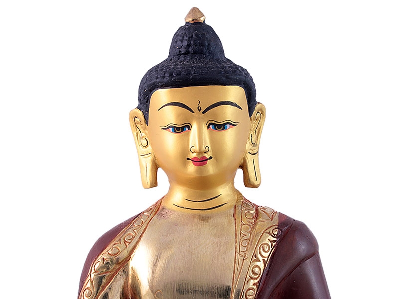 Wunderschöne feuervergoldete Akshobhya Statue. Die Statue wurde in aufwendiger Handarbeit nach dem Wachsausschmelzverfahren gefertigt. Die Figur ist aus Kupfer, der Körper teils feuervergoldet und das Gesicht mit Goldfarbe bemalt.