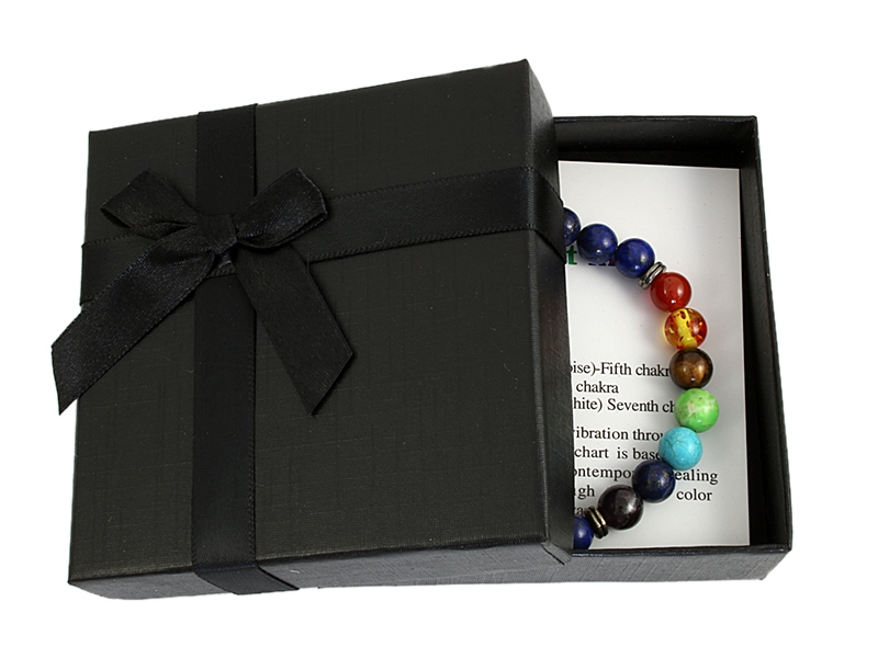 Schönes Edelstein Armband, bestehend aus Lapislazuli Perlen und 7 Edelsteinen in den Chakra Farben. Die Perlen sind auf einem elastischen Band aufgezogen. Das Armband wird mit einer schwarzen Geschenkbox und einer kleinen Beschreibung geliefert.