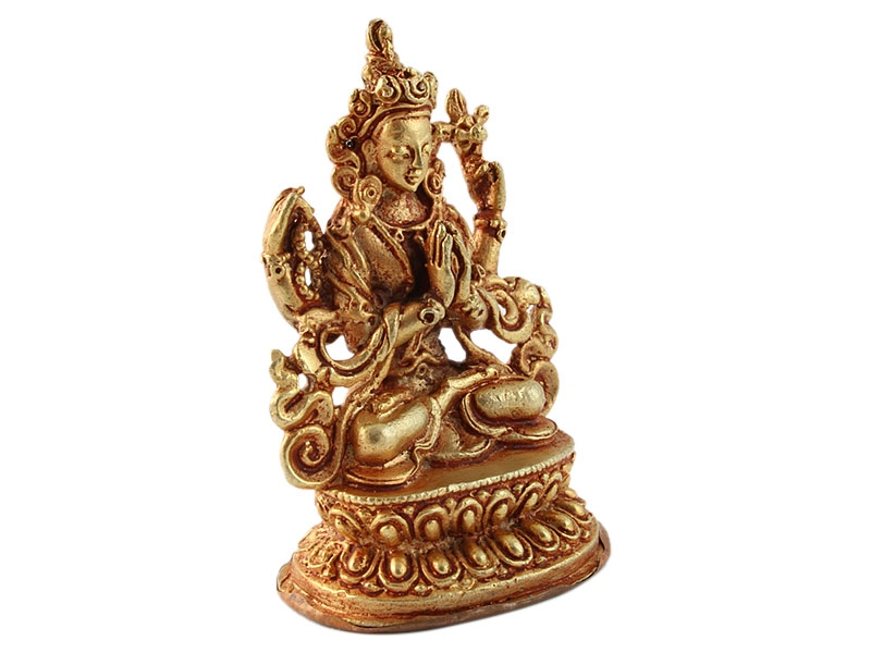 Von allen Gottheiten im Mahayana-Buddhismus der Bodhisattva Avalokitesvara, ist Chenrezig einer der bekanntesten. Chenrezig ist die Verkörperung des Mitgefühls aller Buddhas. Er hat vier Arme, als Zeichen von liebender Güte, Freude, Gleichmut und Mitgefühl. Zwei seiner Hände sind in Gebets Position, in seiner linken Hand hält er eine Lotusblüte und in der rechten Hand eine Kristallmala, mit der das Rezitieren des Mantra „Om Mani Padme Hume“ abzählt.
