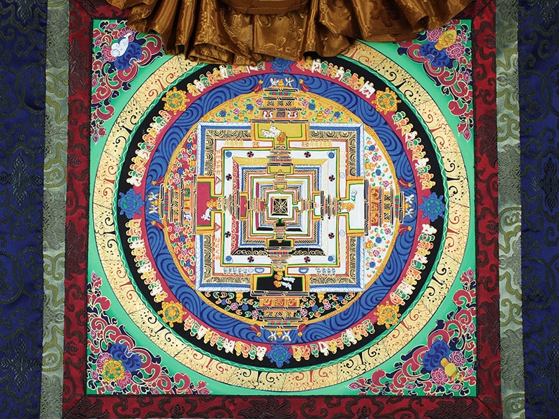 Kalachakra Mandalas sind komplexe und tief symbolische Diagramme, die im tibetischen Buddhismus eine wichtige Rolle spielen. Kalachakra (Sanskrit, Kala (Zeit) Chakra (Rad) – Rad der Zeit) ist eines der beliebtesten Mantras in Tibet. Es symbolisiert die Einheit zwischen Kosmos und dem menschlichen Körper. Oft wird es auch als „Zeit-Zyklen“ übersetzt und repräsentiert die Zyklen der Planeten, den unseres Atems und der Steuerung der Energien in den Körpern auf dem Weg zur Erleuchtung.