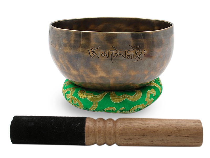 Nepalesisches Mond Klangschalen Set - Handgefertigt unter dem Vollmond. Dieses edle Klangschalen-Set stammt aus Nepal und wurde in einer hellen Vollmondnacht in traditioneller Handarbeit gefertigt. Die Außenseite der Schale ist kunstvoll mit dem Mantra "Om Mani Padme Hum" sowie dem chinesischen Schriftzeichen für Langlebigkeit graviert, was ihr eine besondere spirituelle Tiefe verleiht. Das Set enthält eine handgefertigte Klangschale, ein grünes Bokatringkissen sowie einen Holzklöppel – ideal für Meditation, Klangheilung und Entspannung.