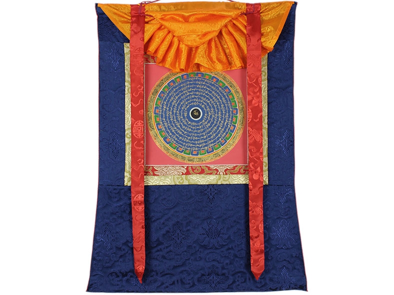 Eingefasst in einen edlen dunkelblauen Brokatrahmen, präsentiert sich dieses tibetische Om Mantra Mandala Thangka in seiner ganzen Pracht. Der Brokat verleiht dem Gemälde einen reichen und kunstvollen Rand, der die Schönheit und Heiligkeit des Thangka-Gemäldes betont. Das Thangka wurde in feinster Lupenmalerei nach tibetischer Tradition auf reiner Baumwoll-Leinwand gefertigt und mit Naturfarben sowie echtem Gold veredelt. Es zeigt das kraftvolle Mantra von Chenrezig, „Om Mani Padme Hum“, in schimmerndem Gold. Im Zentrum des Mandalas thront das Om-Symbol, kunstvoll umrahmt von filigranen Ornamenten. Aufgrund der Lichtverhältnisse beim Fotografieren können die Farben leicht vom Original abweichen.