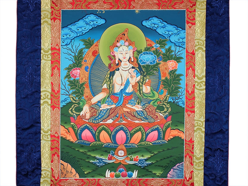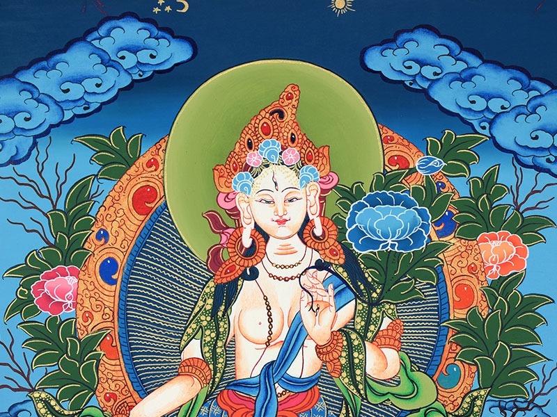 Die Weiße Tara (Sitatara) ist ein Aspekt des weiblichen Buddhas und die weibliche Verkörperung von Chenresig. Beschützend und weise. Sie repräsentiert Reinheit, Reife und Mitgefühl. Sie hält in der linken Hand als Zeichen ihrer Reinheit den Stängel einer weißen Lotusblüte. In der rechten zeigt sie die Mudra der Großzügigkeit. Mit ihren sieben Augen kann sie Hilfsbedürftige in aller Welt wahrnehmen. Sie ist die Hüterin der Weisheit und weiblicher Bodhisattva des langen Lebens.