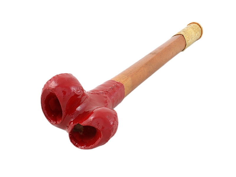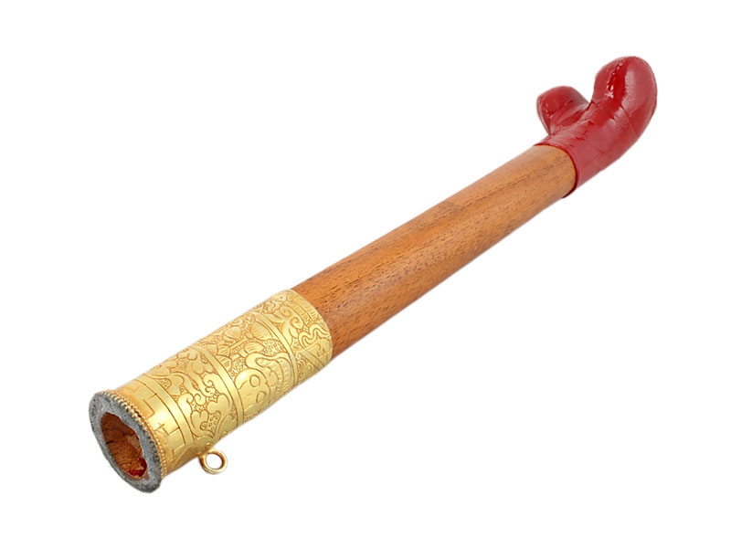 Diese hochwertige tibetische Ritual Kangling Trompete wurde von bhutanischen Mönchen in Nepal gefertigt. Im Gegenzug zu früheren Versionen ist hier der menschliche Oberschenkelknochen durch Holz ersetzt. Das oberen Ende ist mit rotem Kunststoff überzogen und das Mundstück besteht aus Messing. Die Holz-Kangling wird traditionell in der Praxis von Chöd-Ritualen und anderen tantrischen Praktiken verwendet. Die Kangling wird in einer schönen Brokat-Tasche geliefert. Aufgrund der Handarbeit kann es zu leichten Abweichungen vom Produktbild kommen.
